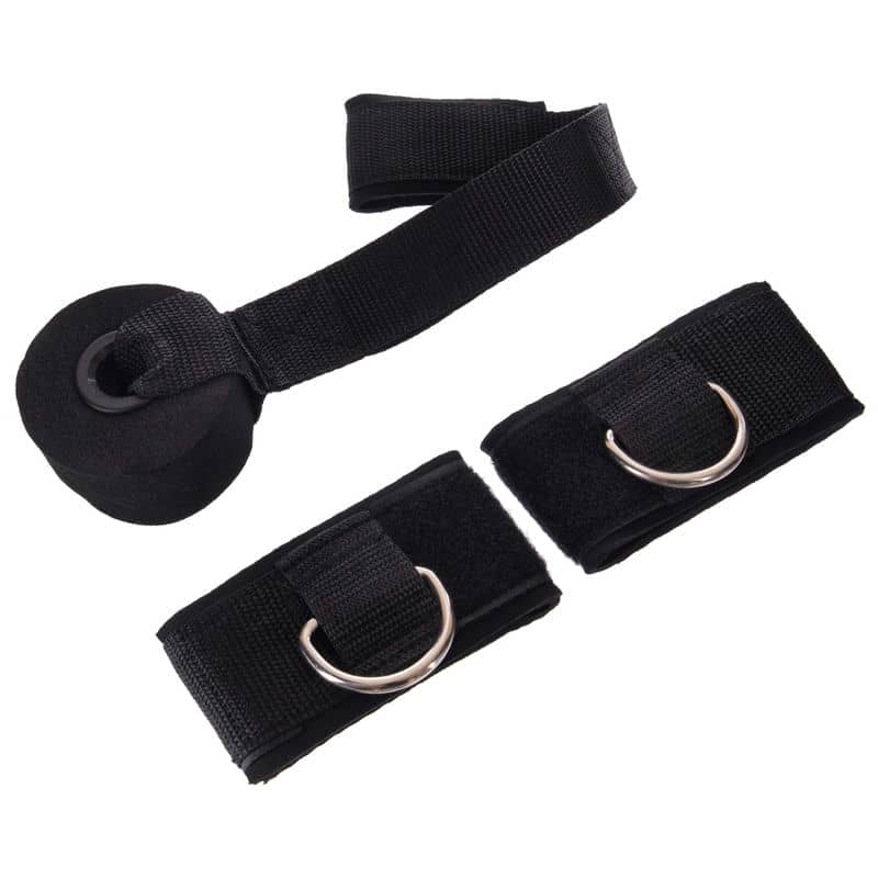 Однією з ключових деталей набору є зручні лямки (манжети) на липучках, які м'яко, але надійно фіксуються навколо щиколоток, не натирають і не заважають рухам. Їхня широка форма виключає перетискання кровотоку, а металеві кільця забезпечують легке кріплення будь-яких стандартних джгутів. Другий важливий елемент - кріплення дверей: компактна, але міцна петля з поліестеру з масивною гумовою шайбою дозволяє надійно зафіксувати еспандер в дверному отворі. Це рішення моментально перетворює будь-які двері на міні-спортзал, що не вимагає стаціонарного обладнання.