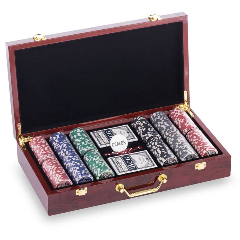 Покер - це одна з найпопулярніших карткових ігор. Але незважаючи на відносно прості правила, вона вимагає зосередженості і підвищеної уваги, тому дуже важливо, щоб гравців оточував порядок. Для цього і призначений покерний набір - в ньому є все необхідне для організованої гри, а наявність фішок, які вигідно відрізняються банкноти, дозволяє уникнути хаосу на столі. Компактний елегантний кейс дозволяє використовувати набір не тільки в домашніх умовах, але і взяти його з собою на гру поза домом. Також він підходить для організації невеликих покерних турнірів. Кейс (чемодан), призначений для зберігання набору, виготовлений з високоякісної штучної шкіри, яка, крім міцності і стійкості до зношування, відрізняється чудовим зовнішнім виглядом. Він закривається надійним замком-клямкою, а для перенесення має зручну металеву ручку. У наборі є комплект пластикових фішок з номіналом - для ставок, і фішка дилера - нею позначають гравця, що здає карти. Крім фішок є дві стандартні колоди карт, які можна використовувати для будь-якої карткової гри, а також гральні кістки для розписного покеру на кістках.