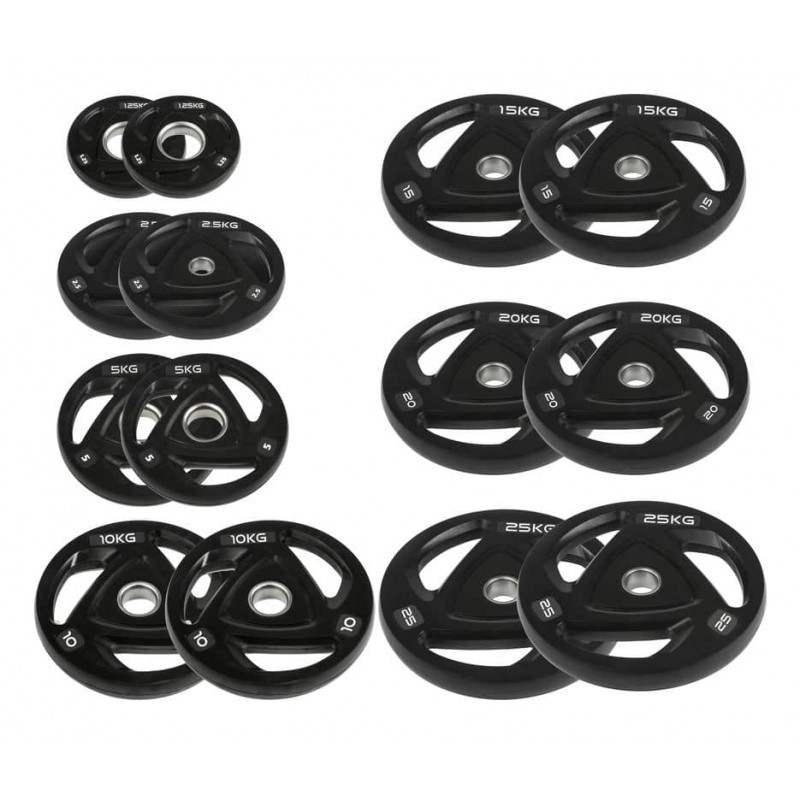 Вага: 2 х 1,25 кг; 2 х 2,5 кг; 2 х 10кг; 2 х 15кг; 2 х 20кг; 2 х 25кг