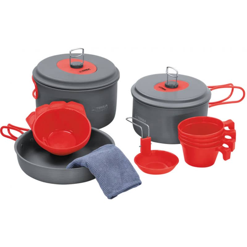 Набір посуду з анодованого алюмінію для 3-4 осіб, складається з двох казанків, кришки-сковорідки. До набору також входять комплект з мисок та чашок для чотирьох осіб, черпак та ганчірка для миття посуду. Набір упакований в зручний сітчатий чохол.