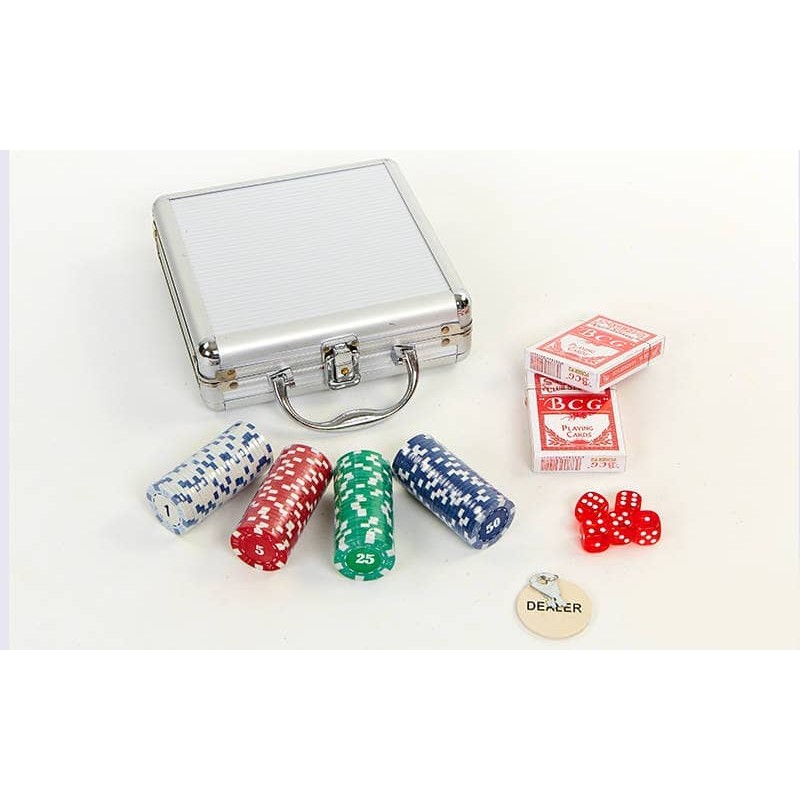 Для зберігання набору служить алюмінієвий кейс, оснащений надійною засувкою, зручною ручкою, а також ложементом усередині, що надійно фіксує всі необхідні для ігор елементи. До складу набору входять дві колоди пластикових карток на 54 аркуші кожна, 5 гральних кісток із міцного пластику, а також комплект фішок з різним номіналом, які призначені для ставок у процесі гри. Вони, по суті, є еквівалентом грошей і дозволяють уникнути плутанини на столі. Також в набір входить фішка дилера – з її допомогою позначають порядок дій у грі.>