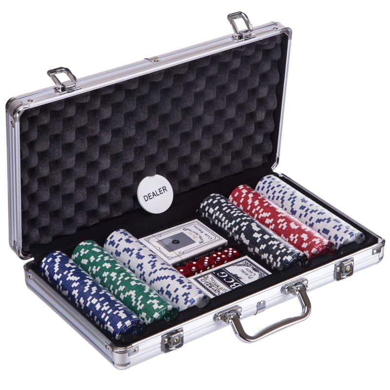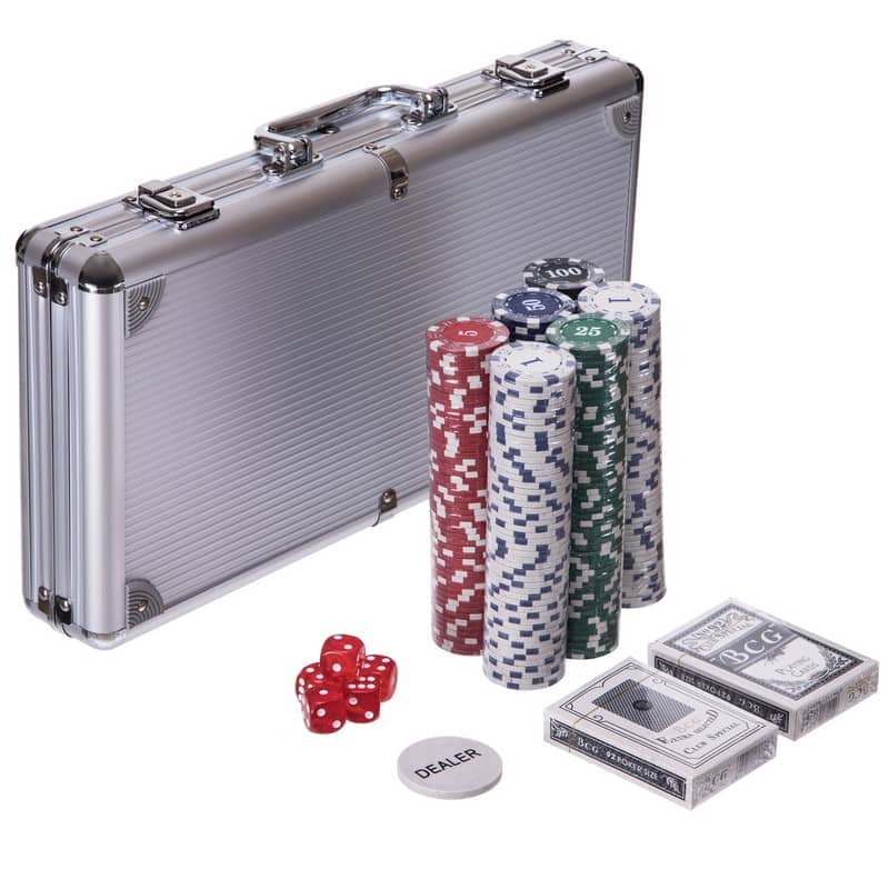 Цей набір призначений для гри в покер – однією з найпоширеніших та найпопулярніших карткових ігор. Ця гра не тільки допомагає весело провести вільний час, а й розвиває вміння аналізувати доступну інформацію та оптимально оцінювати свої шанси на підставі цього аналізу. Також вона покращує пам'ять та здатність прораховувати різні варіанти розвитку подій. У цьому наборі є все необхідне для покеру на кістках, техаського холдему, блекджека, різного роду турнірів у карткових клубах або нічних покерних поєдинків з друзями. а також ложементом усередині, що надійно фіксує всі необхідні для ігор елементи. До складу набору входять дві колоди пластикових карток на 54 аркуші кожна, 5 гральних кісток із міцного пластику, а також комплект фішок з різним номіналом, які призначені для ставок у процесі гри. Вони, по суті, є еквівалентом грошей і дозволяють уникнути плутанини на столі. Також в набір входить фішка дилера – з її допомогою позначають порядок дій у грі.>