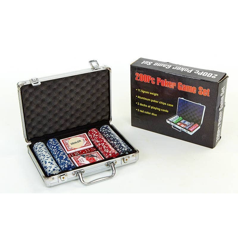 Цей набір призначений для гри в покер – однією з найпоширеніших та найпопулярніших карткових ігор. Ця гра не тільки допомагає весело провести вільний час, а й розвиває вміння аналізувати доступну інформацію та оптимально оцінювати свої шанси на підставі цього аналізу. Також вона покращує пам'ять та здатність прораховувати різні варіанти розвитку подій. У цьому наборі є все необхідне для покеру на кістках, техаського холдему, блекджека, різного роду турнірів у карткових клубах або нічних покерних поєдинків з друзями. Для зберігання набору служить алюмінієвий кейс, оснащений надійною засувкою, зручною ручкою, а також ложементом усередині, який надійно фіксує всі необхідні для ігор елементи. До складу набору входять дві колоди пластикових карток на 54 листи кожна, 5 гральних кісток із міцного пластику, а також комплект фішок з різним номіналом, які призначені для ставок у процесі гри. Вони, по суті, є еквівалентом грошей і дозволяють уникнути плутанини на столі. Також в набір входить фішка дилера – з її допомогою позначають порядок дій у грі. >