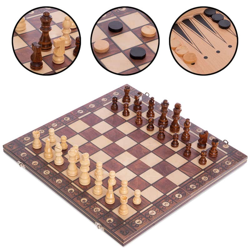 <Призначення Шахи, шашки та нарди, зібрані в цьому наборі, відносяться до стратегічних настільних ігор і здавна користуються популярністю. Різноманітність варіантів перебігу гри робить їх надзвичайно захоплюючими, причому, незважаючи на різну специфіку, вони однаково корисні для мозку людини. Ці ігри розвивають логічне мислення та здатність аналізувати свої дії, покращують пам'ять та вчать передбачати наслідки своїх дій. Набором можна користуватися вдома, і в той же час досить компактний, щоб взяти його з собою в дорогу.