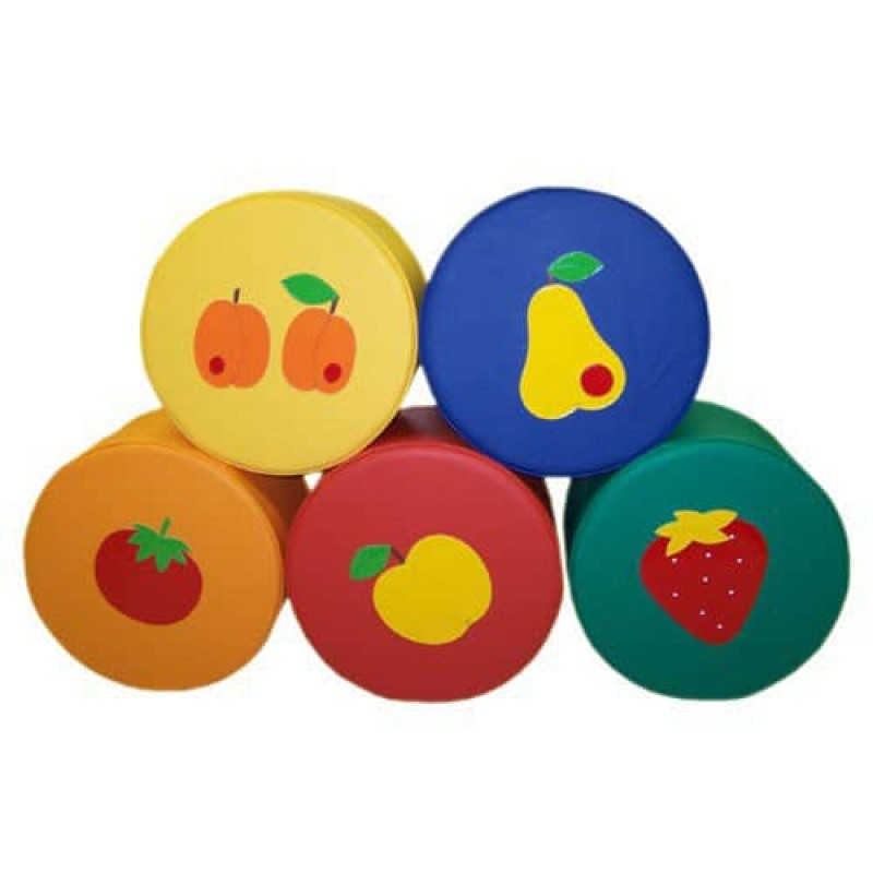 Опис: яскраві, кольорові пуфики - це не тільки місце для занять і відпочинку, а ще й цікавий ігровий тренажер. Малюк вивчає кольори, фрукти, докладає фізичні зусилля по підняттю вироби, перекочування, перестановки. Крім того, це відмінний спосіб ідентифікації предметів інтер'єру під конкретну дитину, що особливо важливо для дитячих садків та шкільних установ дитячого розвиваючого профілю.