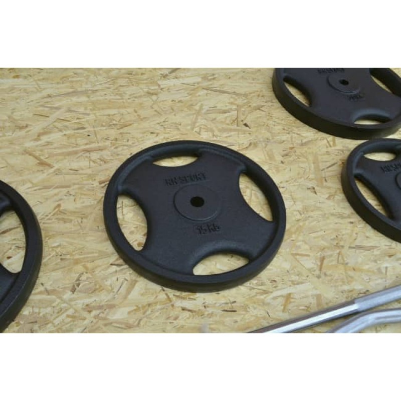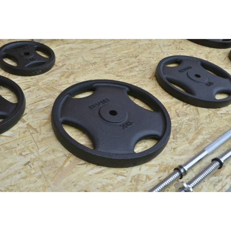 Диски виготовлені із металу. Після обробки диски розігрівають у печі до температури 180-200 градусів, фарбують удароміцною фарбою і знову запікають до формування міцної кірки. Завдяки дискам вагою 1.25 кг можна тренуватися з мінімальним кроком ваги. Зручності у використанні додає металеві хромовані грифи з насічкою проти ковзання рук та двома затискними гайками, які мають гумові втулки для щільної та надійної фіксації дисків.