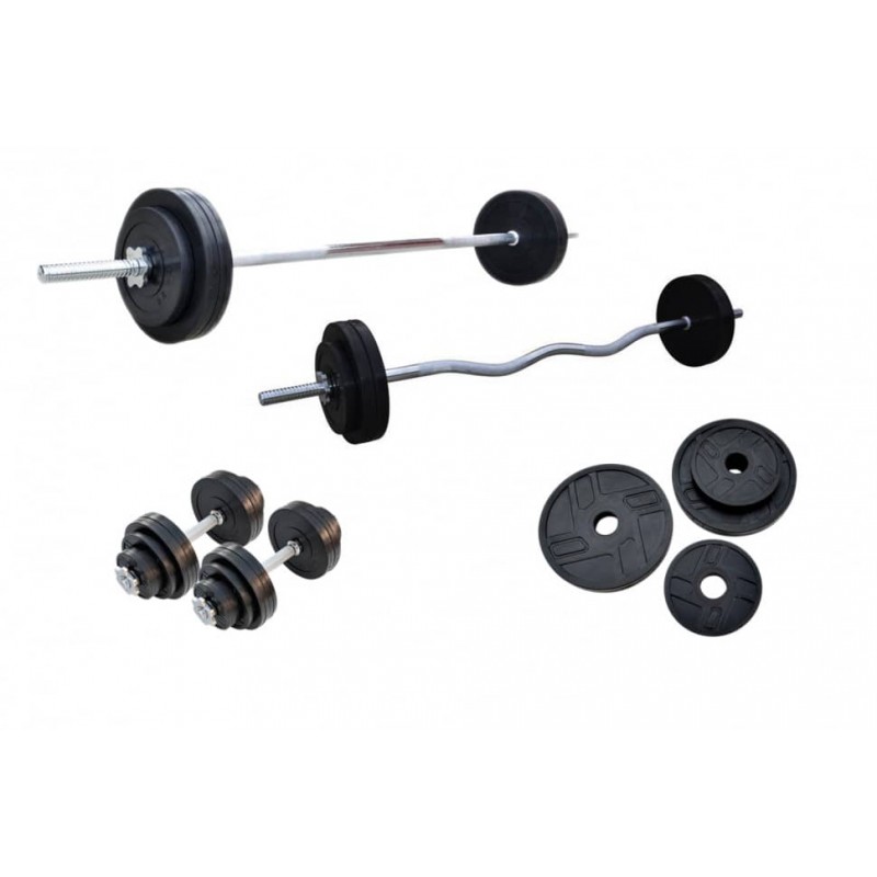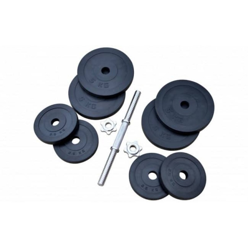Міцний метал тримає навантаження до 100 кг, а затискні баранчики з гумовими фіксаторами щільно притискають диски для безпечного заняття.