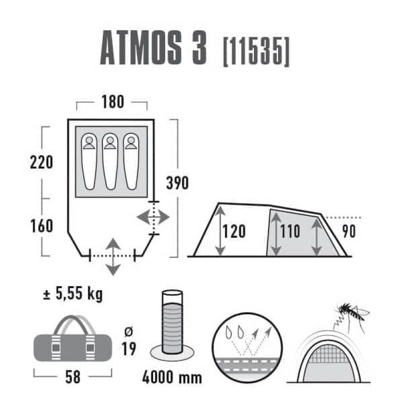 Кемпінговий 3-ох місний намет High Peak Atmos 3 призначен для комфортного відпочинку на природі. Це відмінний варіант для всіх охочих відвідати різні фестивалі під відкритим небом або для подорожей. Модель має подовжений тамбур, два входи і велику площу вікон. Москітна сітка, проклеєні шви тенту, фірмова система вентиляції "Vario Vent Kontrol". Намет швидко встановлюється, має порівняно невелику вагу для кемпінгових наметів, і достатній ступінь водонепроникності, завдяки чому цілком може бути використана для туристичних походів.