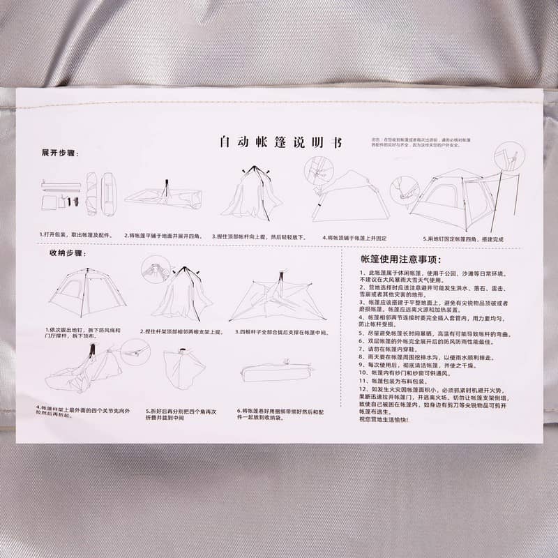 Для складання намету потрібно використовувати автоматичний стрижень зі скловолокна. За допомогою металевих цвяхів намет можна зафіксувати на землі на випадок сильного вітру. Автоматичний каркас робить складання намету швидким і простим.