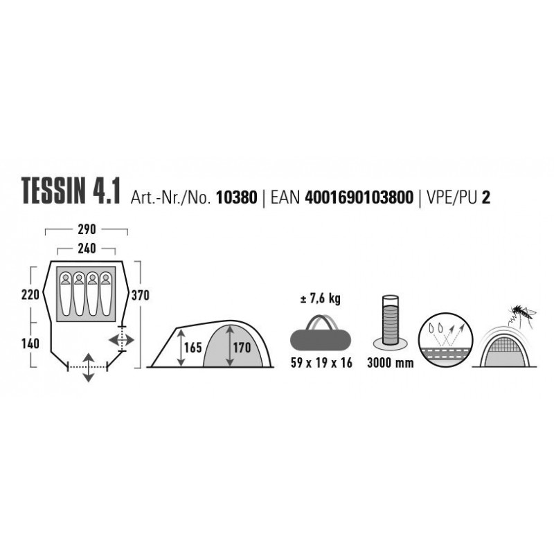 High Peak Tessin 4.1 Deep Forest (10380) - чотиримісний купольний намет із просторим тунельним тамбуром і додатковим бічним входом. Модель має алюмінізоване покриття зовнішнього тенту, яке зміцнює тканину та знижує підвищення температури всередині в сонячну погоду. Намет оснащений екологічно чистим водовідштовхувальним DWR-просоченням без PFC елементів. Дві високоефективні системи вентиляції Advanced Low Vent System забезпечують оптимальну циркуляцію повітря навіть у дощові дні. Достатня відстань між внутрішнім наметом і зовнішнім тентом суттєво зменшує утворення конденсату. Затемнена спальня не пропускає яскраве світло, дозволяючи виспатися всім, хто пізно прокидається. Система вентиляції внутрішнього намету Vario Vent Control забезпечує регульований потік свіжого повітря, щоб ви могли виспатися ще краще. Всі шви дна і тенту проклеєні спеціальною стрічкою, гарантуючи захист від проникнення вологи в дощову погоду. В наметі зможуть без проблем розміститися три-чотири людини з усім спорядженням. Намет чотиримісний High Peak Tessin 4.1 Deep Forest (10380) стане чудовим вибором для комфортного сімейного відпочинку протягом вихідних.