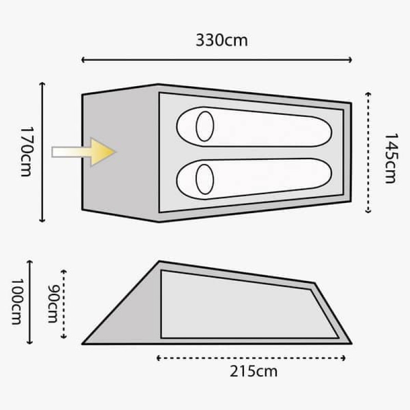 внутрішній намет (ДхШхВ), мм 2150 х 1450 х 900Зовнішня намет (ДхШхВ), мм: 3300 х 1700 х 1000У складеному вигляді (ДхШхВ), мм: ∅ 130 x довжина 420Вага палатки, кг: 3