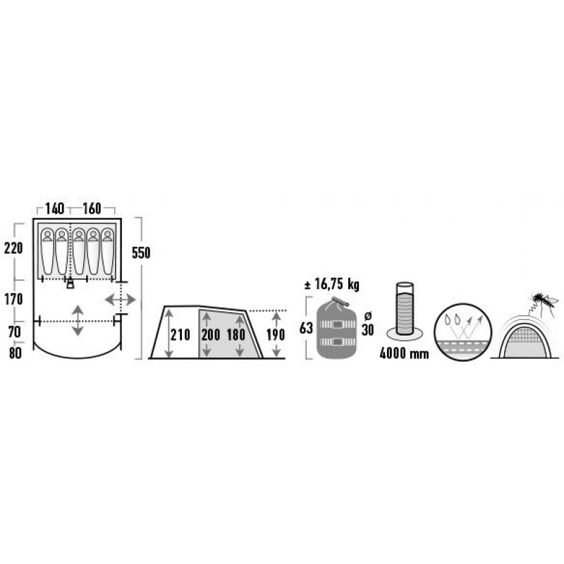 High Peak Garda 5.0 Light Grey/Dark Grey/Green (11823) - п'ятимісний тунельний намет із двома входами, вітальнею зі вшитою підлогою, що забезпечує захист від настирливих комах та небажаних протягів. Великий інтегрований навіс із прозорими вікнами створює тінь і допомагає запобігти попаданню дощу всередину під час відчинення дверей. Передню стінку можна згорнути, щоб збільшити корисну площу намету. Житлова зона з висотою стелі 2,1 м дозволяє стояти на повний зріст, а також має достатньо місця для розміщення кемпінгових стільців, столу та похідного спорядження. Передні сітчасті двері з клапаном на блискавці забезпечують постійний приплив свіжого повітря в намет. Бічні сітчасті двері збільшують приплив свіжого повітря і захищають від комах. Прозорі вікна у житловій зоні наповнять приміщення світлом, а штори за необхідності забезпечать усамітнення. Дах має тепловідбивне алюмінізоване покриття, що знижує підвищення температури всередині намету вдень у сонячну погоду.