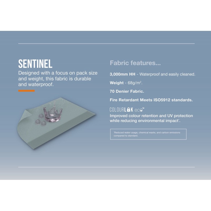 - Тканина Sentinel - коли розмір і вага намету для транспортування є ключовими факторами при виборі, наша спеціально розроблена тканина Sentinel перевершить ваші потреби. Тканина Sentinel є міцною та довговічною, використовує нашу технологію ColourLok для довговічності та водонепроникність до 3000 мм водяного стовпа, що забезпечує чудову якість та продуктивність у поєднанні з компактними розмірами упаковки.