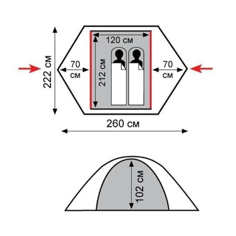 - Два вентиляційних клапана з можливістю відкривання зсередини намета