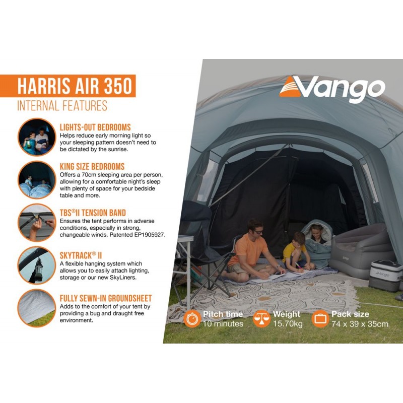 Harris Air 350 — це надувний тримісний намет з технологією AirBeam®, розроблений з упором на вентиляцію. Цей намет складається з кількох сітчастих панелей і додаткової сітчастої панелі позаду спалень, щоб максимізувати вентиляцію та зберегти прохолоду в наметі під час теплих перерв. Завдяки тканині Sentinel намет зберігається в сумці невеликого розміру і низькій вазі, забезпечуючи якість і довговічність намету. Тканина Lights-Out® і спальня розміру King Size забезпечать вам довший сон. Попередньо прикріплений передній навіс забезпечує чудову зону для обіду та відпочинку, пропонуючи додатковий життєвий простір і справжнє відчуття на природі. Harris — ідеальний сімейний намет для літніх канікул.