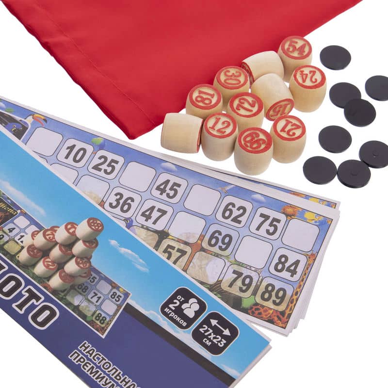 У комплект входить набір бочонок, пронумерованих від 1 до 90, які виготовлені з твердої, належним чином висушеної деревини, що гарантує їм довговічність – вони витримують серйозний механічний вплив і не розсихаються з часом. Також до нього включені спеціальні картки з ламінованого картону та пластикові фішки, а також сукняний мішечок, в який складають барильця під час гри. Все це акуратно запаковано у прозорий чохол, який захищає елементи лото від пилу.