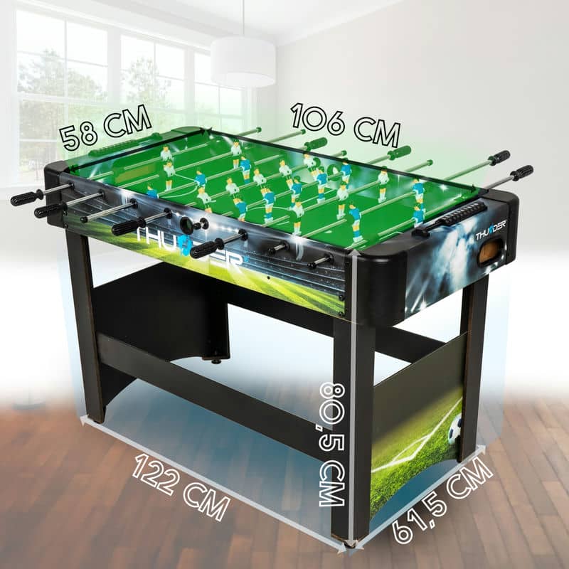 Стіл від Thunder виготовлений з ламінованої МДФ плити стійкої до стирання. Ігрове поле має стриманий дизайн та не відволікає гравців, забезпечуючи повний контроль та видимість м'яча. Фігурки футболістів виконані з якісного ABS пластику та кріпляться на металевих прутнях. Надійний хват гарантують профільовані рукоятки зі щільної гуми, вони не вислизнуть з рук в найвідповідальніший момент, що є основою успішної та точної гри. На додачу, кожен з гравців матиме ручний лічильник аби фіксувати хід поєдинку. Ніжки столу обладнані компенсаторами нерівності підлоги, що дозволить з легкістю провести монтаж навіть на нерівній поверхні. Сам же процес складання не потребує особливих умінь, з ним справиться будь-який користувач.
