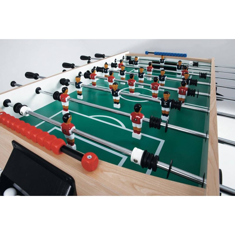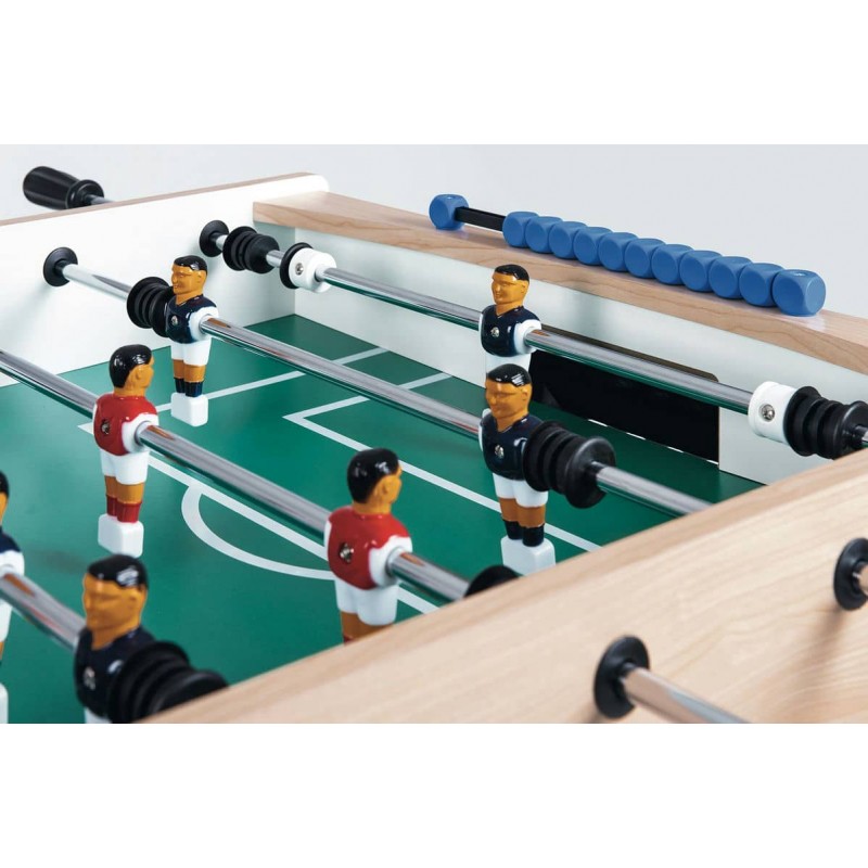 - Ігрове поле з ламінату на основі ДСП зі скошеними кутами. Білі лінії на зеленому тлі нанесені методом шовкографії, відтворюючи футбольне поле.