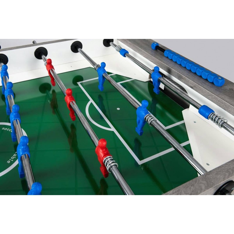 - Ігрове поле із загартованого скла товщиною 5 мм. Білі лінії на зеленому тлі нанесені методом шовкографії, відтворюючи футбольне поле.