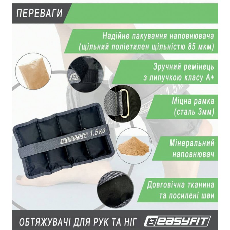 Обтяжувачі вагою 1,5 кг є інноваційним поєднанням високотехнологічних матеріалів, що забезпечують неперевершену міцність і довговічність. Тканина "Оксфорд", що використовується, прошита подвійною капроновою ниткою, що надає їй стійкості до зносу. Додаткове просочення матеріалу надає йому особливу міцність. Ремені, виготовлені з міцного нейлону, та хромовані сталеві рамки товщиною 3 мм гарантують надійне та безпечне використання обтяжувачів. Як наповнювач обраний високоякісний пісок, який запаяний в чохол із міцного ПВХ і упакований в інноваційний мішечок, що повністю виключає можливість розриву або прокидання піску.