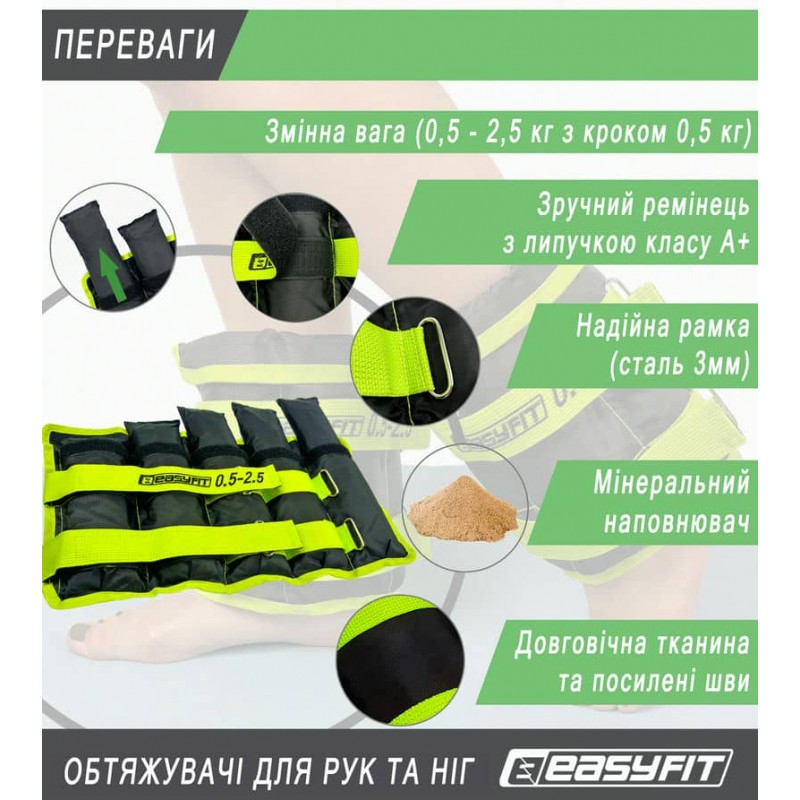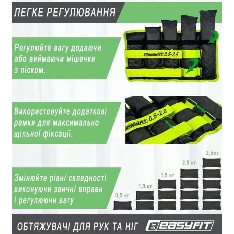 Обтяжувачі набірні EasyFit складаються з 5 мішечків по 0,5 кг і манжети для фіксації на руці або нозі. Це дозволяє поступово змінювати вагу, обираючи оптимальне навантаження на тренуваннях. Обтяжувачі виконані з міцного матеріалу, що гарантує тривалий термін служби. Кріплення на липучках забезпечують зручність при знятті-одяганні обтяжувачів, а також максимальний комфорт при виконанні вправ. Функціональність набірних обтяжувачів дозволяє використовувати їх зі зручністю для ніг, і для рук, регулюючи при цьому вага і відповідно розмір манжети. З обтяжувачами можна проводити як силові, так і кардіотренування. Сучасність дозволяє обрати з широкого асортименту напрямків спортивних занять саме те, що по душі, а комбінуючи їх досягати нових цілей.