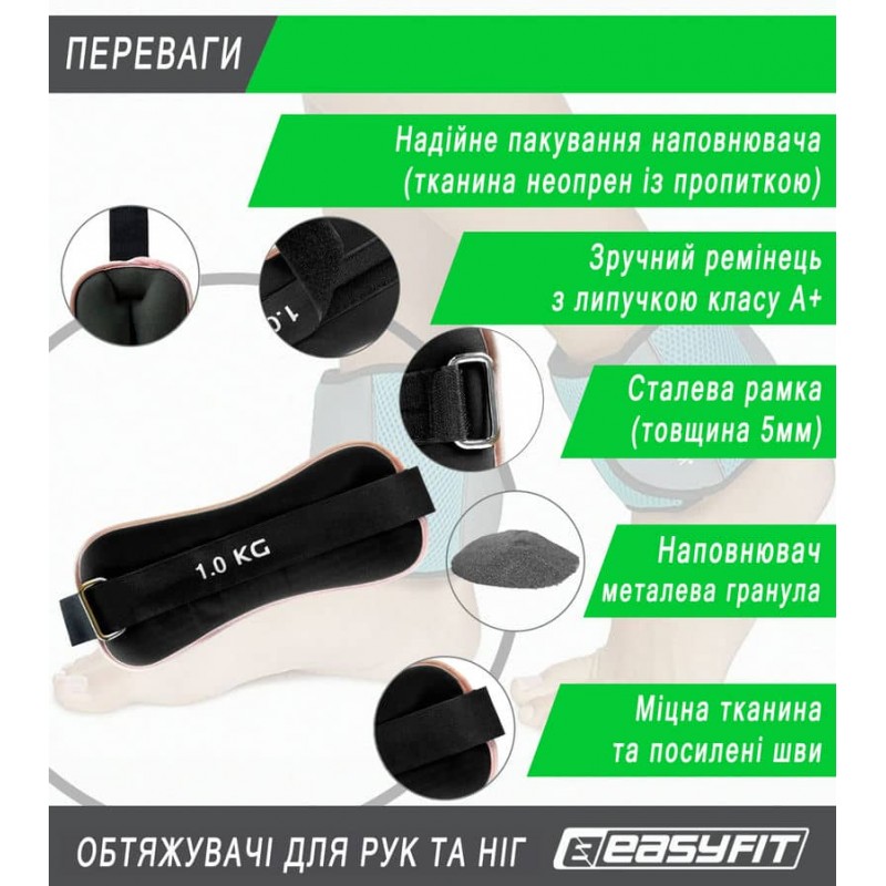 - Довговічність: На відміну від аналогів, обтяжувачі EasyFit Comfort містять сталеві гранули, укладені в тканину з просоченням, що запобігає розривам та витоку сталевих кульок наповнювача. Така конструкція значно збільшує термін служби виробу, роблячи його надійним помічником у будь-яких тренуваннях.