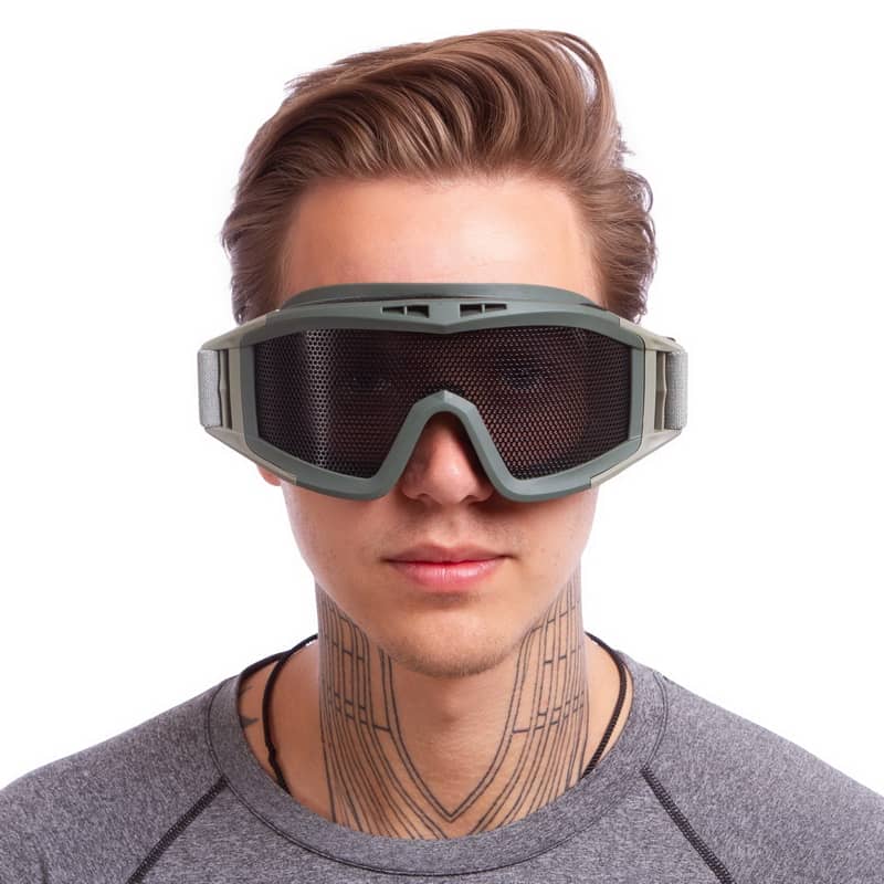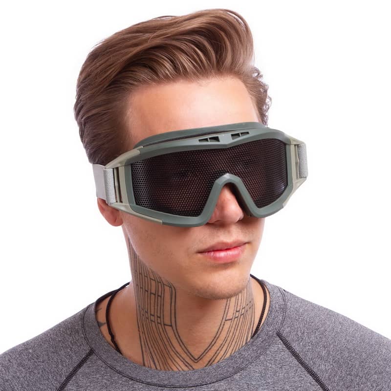 Ці окуляри є масивною оправою, в яку замість звичної скляної або пластикової лінзи вставлена сталева сітка. Завдяки такому рішенню очі користувача добре захищені, але при цьому окуляри не пітніють і, відповідно, їх не доводиться знімати в розпал гри. При цьому сітка абсолютно не заважає бачити те, що відбувається навколо. Матеріал оправи – зносостійкий податливо-пружний пластик, завдяки чому окуляри щільно прилягають до обличчя. На голові вони фіксуються за допомогою широкого еластичного ременя, довжину якого можна відрегулювати за допомогою простої пластикової пряжки.