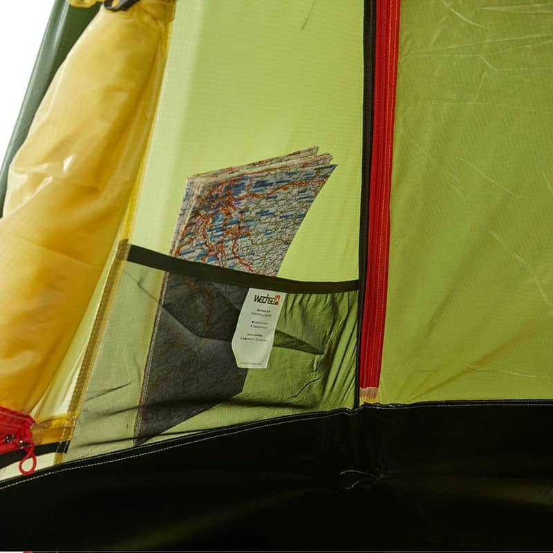 - У верхній половині дверей внутрішнього намету розміщена москітна сітка. Сітка має шторку на блискавці, яка при необхідності закриває сітку для збереження тепла при використанні намету в сухому кліматі і при знижених температурах.