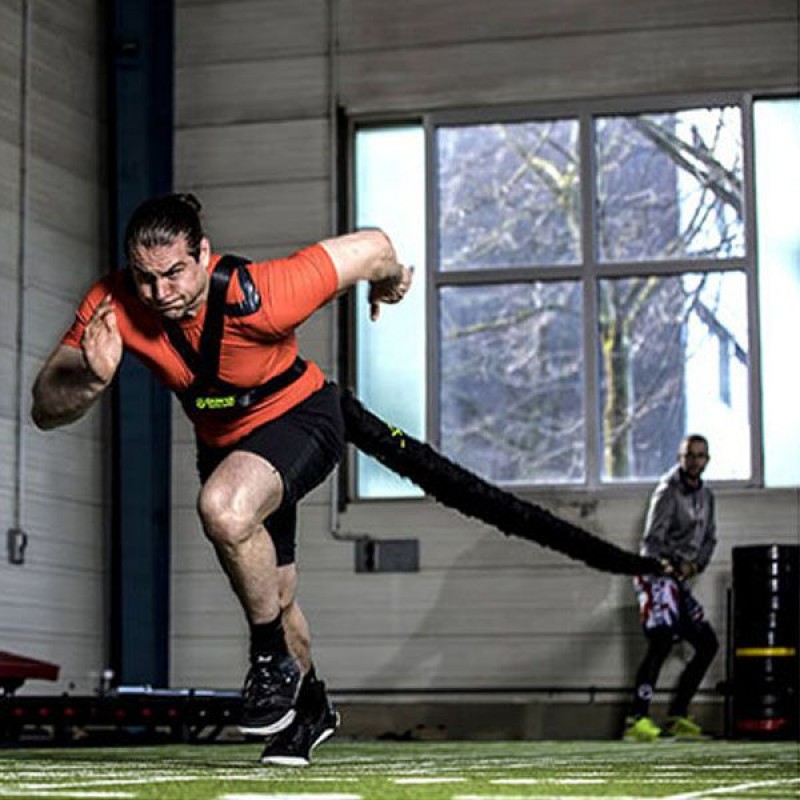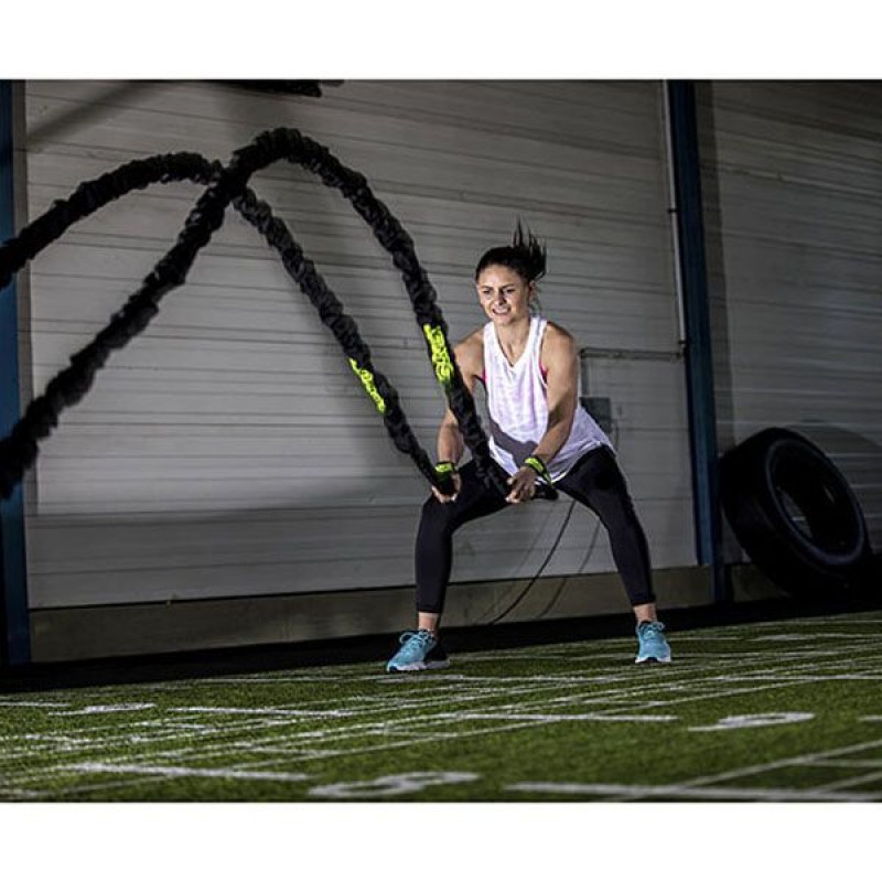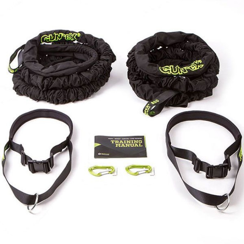 Еластичні бойові канати GUN-eX - це спортивний тренажер для тренування всього тіла, розроблений для проведення класичних групових занять і занять в малих групах. Він ідеально підходить для високоінтенсивних інтервальних тренувань (HIIT), які ефективні в боротьбі із зайвою вагою. Один набір розрахований на використання двома людьми одночасно, для занять в парах. Важливою особливістю цього обладнання є його універсальність, воно підійде практично всім, незалежно від статі, віку і рівня підготовки. Пакет GUN-eX включає в себе не тільки набір спортивного інвентарю, а й повний доступ до мобільного додатку, відео вправ/тренувань, можливість пройти навчання у сертифікованих тренерів GUN-eX. Захисне покриття канатів CORDURA (стійкість до стирання, не боїться вологи); парашутні нитки; ремені, розроблені для використання військовими. Різні варіанти кріплення для використання як усередині приміщення, так і на відкритому повітрі. Карабіни тестуються з використанням екстремальних навантажень, а також оснащені спеціальним фіксатором для запобігання втрати або крадіжки. Елементи, які кріпляться на тіло, наповнені неопреном для більшого комфорту під час тренування. У комплекті йде навчальний посібник з основними тренуваннями. Додаток для тренувань GUN-eX mobile доступен для скачування на Apple App Store і Google Play Store. Карабін: 2 шт, сталь і алюміній, з фіксатором від втрати або крадіжки. Пояс для кріплення на стегна: 2 шт. Довжина каната (min - max): 5,5 м - 12 м. Рівень опору: 1 канат - 30 кг (300 Ньютонів) при максимальній довжині, 2 каната - 60 кг при максимальній довжині.