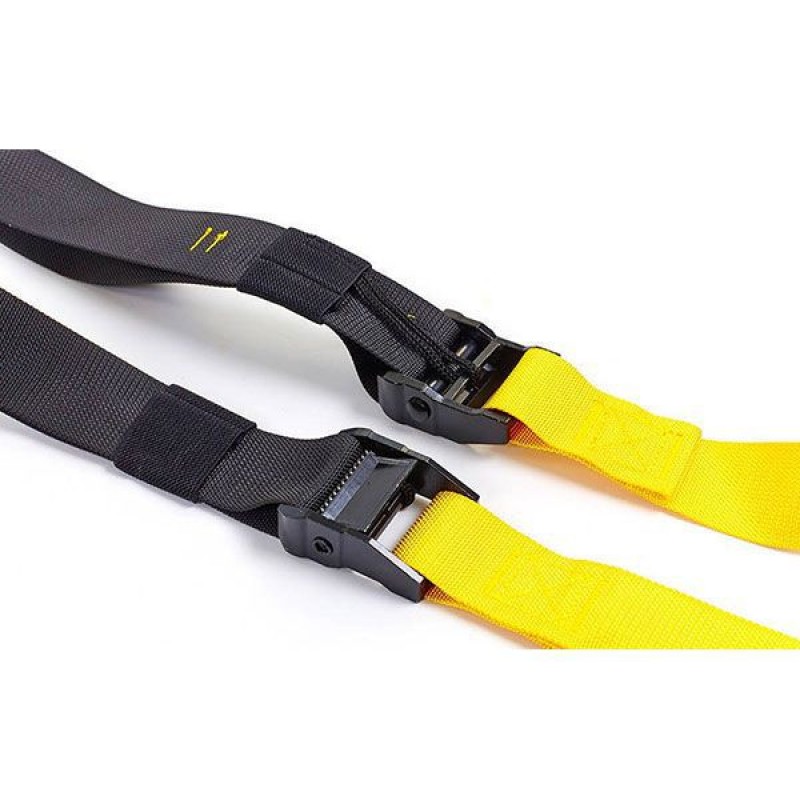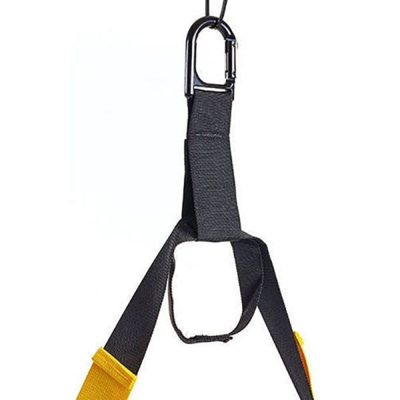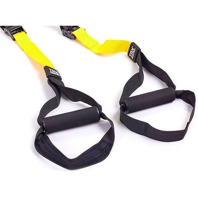 В комплект TRX входять функціональні петлі, дверне кріплення, підвісне кріплення з карабіном, DVD-диск, блокнот і брошури з прикладами вправ і спортивною програмою, сумка для зберігання петель. Підвісні петлі являють собою суцільну стропу, протягнути в стабілізуючу петлю з основним карабіном. Стабільність підвісної системи забезпечує замикає петля (знаходиться нижче). На стропі є показники середньої довжини, "настройки" петель, а також прикінцеві пряжки. Пряжки виконані з металу, з'єднують елементи підвісних петель і сприяють утриманню ваги користувача. На кінцях стропи знаходяться ергономічні ручки і лямки для стоп. Поверхня ручок виконана з неопрену. Це робить їх м'якими і зручними. На внутрішній стороні лямок для ніг є м'яка тканинна нашивка. У вертикальному підвішеному становищі тренажер виглядає як перевернута буква Y. Підвісне кріплення з карабіном - це подвійна стропа з проміжними кріпильними петлями. З одного боку підвісного кріплення є "нижня петля", в яку протягується функціональна петля TRX. З іншого - металевий карабін. Дверне кріплення складається з фіксатора у вигляді подушечки з твердої металевою пластиною всередині і стропи з "нижньою петлею", в яку протягується функціональна петля. Призначено для фіксації петель на двері. Наявність DVD-диска і блокнота з розробленою спортивною програмою, а також прикладами вправ дозволяє проводити повноцінний силовий тренінг без допомоги персонального тренера. Зберігати петлі зручно в спеціальній сумці з сітчастої тканини. Сумка затягується на шнурок. Упаковка: кольорова картонна коробка. Довжина однієї функціональної петлі: 1 м 53 см. Можливість регулювати довжину петель: є. Ширина петлі: 4 см. Матеріал стропи: нейлон. Довжина однієї ручки: 13 см. Діаметр однієї ручки: 3,5 см. Матеріал ручок: неопрен, пластик (пластикова основа, Неопренове покриття). Наявність лямок для ніг: є. Довжина однієї лямки для ніг (стропи): 13 см. Наявність замикаючих пряжок (регуляторів довжини петель): є. Матеріал замикаючих пряжок: метал. Колір функціональних петель: чорний з додаванням жовтого кольору. Підвісне кріплення з карабіном: загальна довжина кріплення (стропи) 88 см. Ширина стропи: 4 см. Наявність проміжних кріпильних петель: є. Довжина проміжної кріпильної петлі: 8 см. Матеріал карабіна: метал. Розмір карабіна (LxB): 8х5,5 см. Колір кріплення: жовтий з додаванням чорного кольору. Дверне кріплення: довжина (стропи): 43 см. Ширина стропи: 4 см.Розмір фіксатора для закріплення тренажера на тренувальній поверхні (LxB): 14х8 см. Колір кріплення: чорний. Сумка для зберігання петель: 27х24 см. Матеріал: сітчаста тканина. Колір: чорний з додаванням білого і жовтого кольорів. * Характеристики, колірна гамма, упаковка і комплектація товару можуть змінюватися виробником без повідомлення.