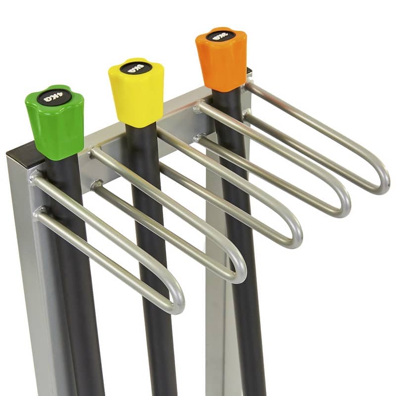 Бодібари не торкаються підлоги, а впираються в основу стійки. Обмежувачі поділяють конструкцію на 4 секції у верхній і нижній частині, причому кожна секція вміщує до 4 одиниць інвентарю.