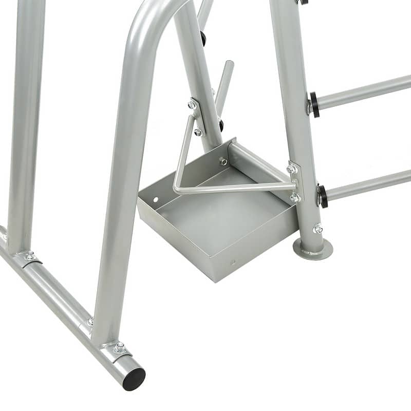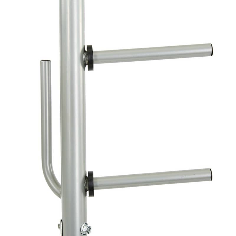 Стійка вертикальна Zelart TA-8212 виготовлена з металевих труб різного діаметра. Товщі труби використані в рамі, а тонкі виконують функцію навантажувальних кілочків для дисків. Дві вигнуті труби забезпечують додаткову стабільність конструкції, а також слугують опорою для грифів і бодібарів, які ставляться в спеціальний короб, змонтований у нижній частині підставки. Стійка виконана під нахилом, щоб снаряди залишалися на місці й не могли випадково впасти. Стійкість конструкції забезпечують дугоподібні опорні ніжки.