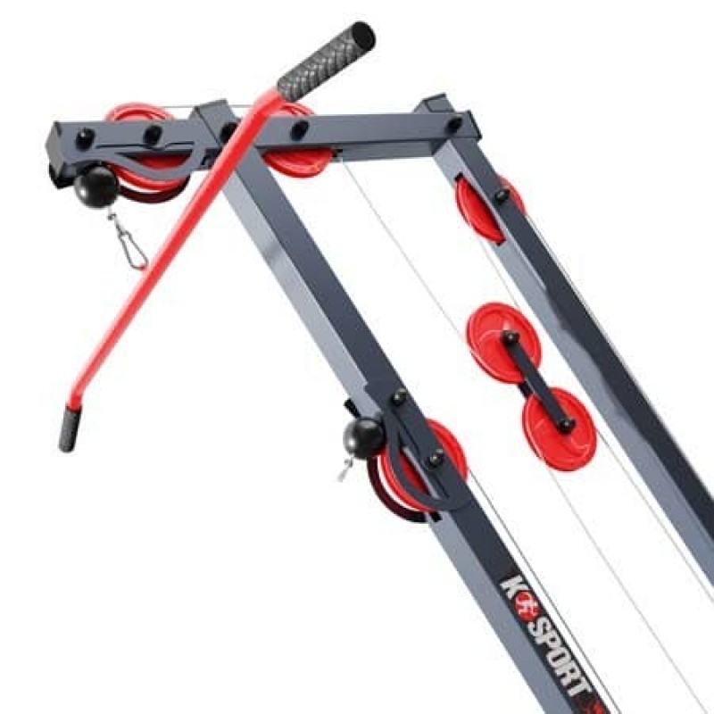 Верхній шків разом з фіксатором ніг ідеально підходить для тренування спини, рук і верхньої частини грудних м'язів. У набір входить червона штанга, яка ідеально підходить для цього виду вправ.