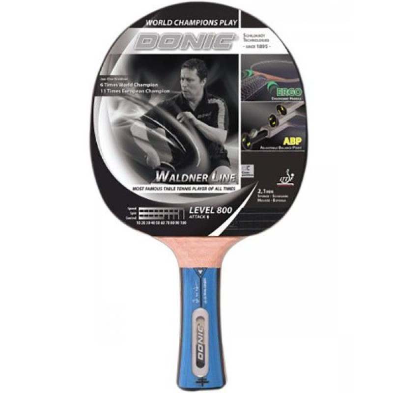Ракетка Donic WALDNER 800 одна із серії ракеток високого рівня, присвячена багаторазовому чемпіону світу і гравцеві Donic-Яну-Ове Валднер. Вся лінійка ракеток спеціально сконструйована для гравців атакуючого стилю. Більшість з них мають додаткові характеристики і застосовувані технології для максимальної якості гри. Застосовувані технології: Adjustable Balance Point (ABP)-Регульована Точка рівноваги. ABP дозволяє гравцеві індивідуально змінювати центр ваги ракетки відповідно до свого стилю гри. Ракетка використовується для атакуючого стилю. Баланс на голову: Зміщення ваги на голову ракетки забезпечує більше сили при ударі, це важливо при атакуючому стилі гри. Баланс по центру: Вага рівномірно розподілений по всій ракетці. Баланс на ручку: Зміщення ваги ближче до ручки дозволяє робити більш точні удари. Просто поверніть, витягніть і регулюйте! Ergonomic Handle (ERGO)-ергономічна ручка. Ручка ERGO ідеально лягає в руку повторюючи лінії долоні. Завдяки дерев'яній вставці з'являється відчуття, що ручка і лопать ракетки є одним цілим. Округла форма дерев'яної вставки нейтралізує тиск на руку і забезпечує надзвичайно зручне і приємне утримування ракетки.Ракетка має в комплекті DVD з тренувальними уроками з настільного тенісу.