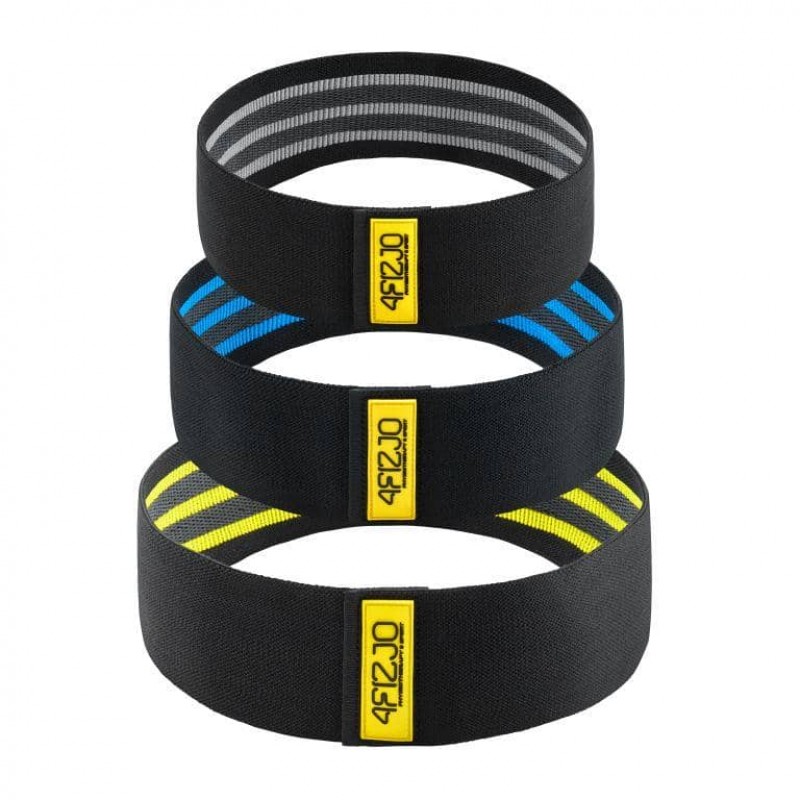 Резинки 4Fizjo виготовляються із високоякісного латексу та еластичної тканини, а тому мають безліч переваг: не натирають шкіру та не врізаються в тіло, зносостійкі та приємні на дотик. Спеціальні протиковзкі елементи з середини еспандера забезпечують йому надійну фіксацію на тілі. Представлений набір складається з 3 резинок різного розміру: S, M та L (чим коротша резинка, тим складніше її розтягувати). Довжина кожної петлі: жовта - 76 см, синя - 70 см, сіра - 66 см по колу. Ширина і товщина у всіх резинок однакова, 8 см і 2 мм відповідно.