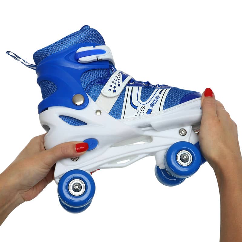 Роликові ковзани-квади мають класичну форму і пластикову розсувну конструкцію в основі. Спереду розташоване зручне гальмо, що дає змогу ролеру легко почати та зупинити рух. Комфорт стопи забезпечують інтегровані лайнери з дихаючих матеріалів, які м'яко, але надійно фіксують положення стопи та міцно тримають ролики на ногах. Відрегулювати посадку можна за допомогою шнурків, автоматичної засувки та липучок. Розмір регулюється.