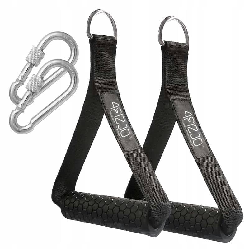Ручки від 4Fizjo виконані з високоякісних матеріалів, а зона хвату прогумована та має спеціальну текстуру, що запобігає зісковзуванню рук. Фурнітура та карабіни металеві, завдяки чому виріб є міцним та витривалим. Наявність в арсеналі таких рукояток дозволяє виконувати верхню, горизонтальну та нижню тяги на спину, розгинання та жим на трицепс, згинання на біцепс. Також з ними роблять поперемінні кросовери та підйоми в сторони на дельти.