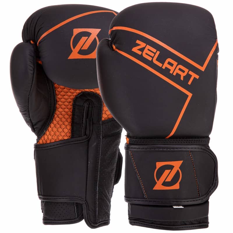 Рукавички боксерські шкіряні на липучці Zelart 10 унцій, чорний-помаранчевий, код: VL-3149_10BKOR