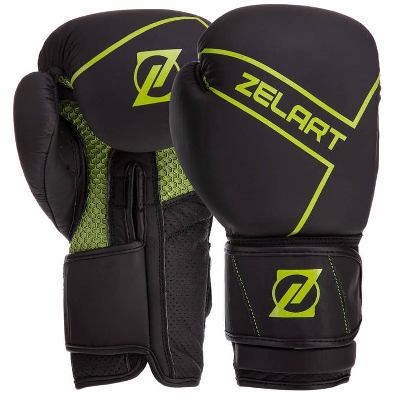 Рукавички боксерські шкіряні на липучці Zelart 10 унцій, чорний-салатовий, код: VL-3149_10BKLG