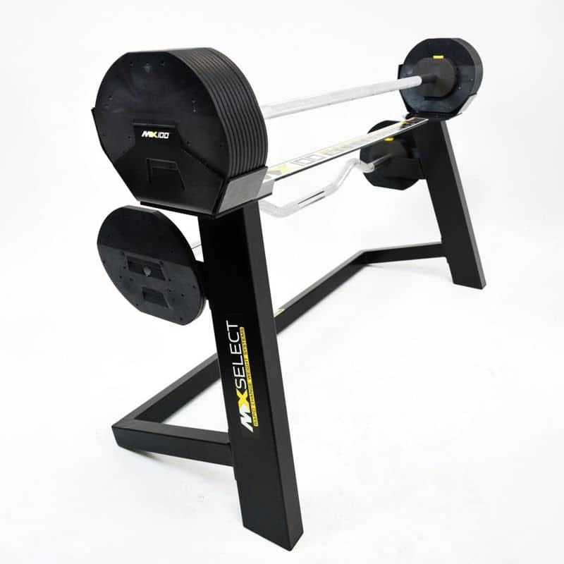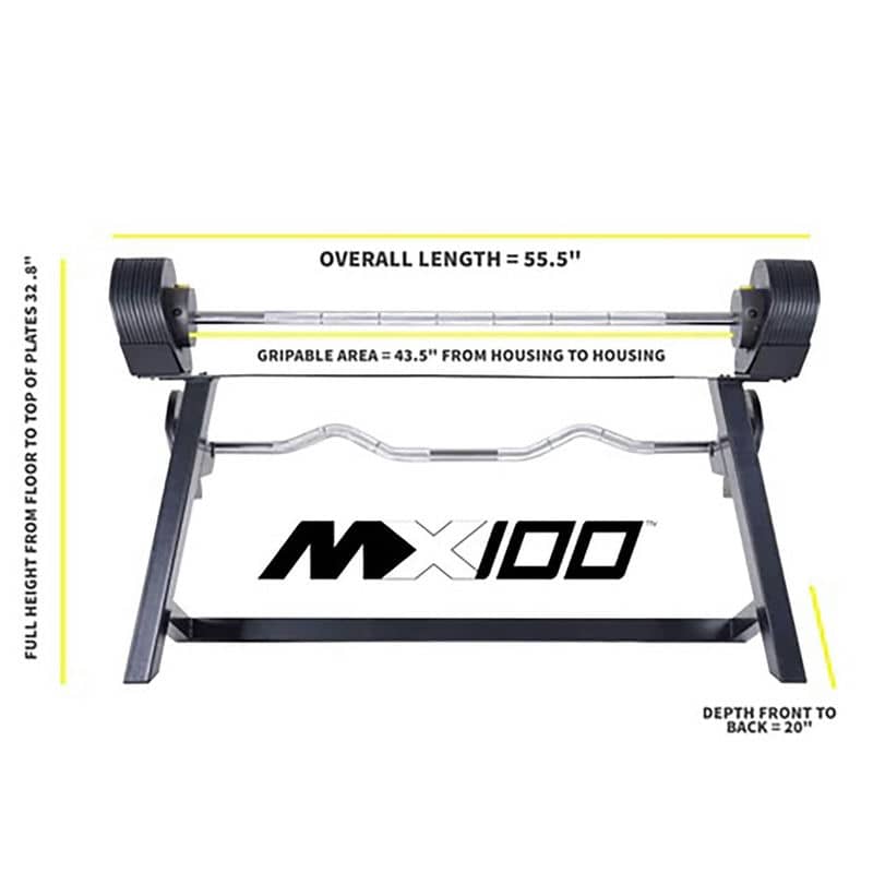 Швидкозмінна система сталевих штанг MX100 включає в себе прямий гриф і W-подібний. гриф, вагою 100 фунтів (45 кг), і все це на витонченій і компактній стійці для зберігання.