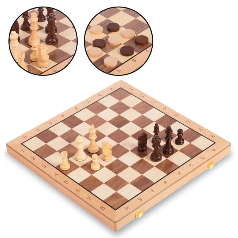 Вхідні в цей набір шахи і шашки ставляться до найбільш поширеним і популярним настільним іграм. Одна - вдумлива, друга - експресивна, будучи об'єднані разом, вони органічно доповнюють один одного і, крім того що надають два захоплюючих способу провести вільний час, стимулюють роботу мозку. Ці ігри вчать передбачити наслідки своїх ходів, покращують пам'ять і розвивають гнучкість мислення. Набором можна користуватися як вдома, так і в шахово-шашкових клубах. Для виготовлення шахових фігур і шашок використовується високоякісна деревина - білі зроблені зі світлої берези, чорні - з темного горіха. Зверху вони покриті безбарвним лаком, який захищає їх від впливу вологи і підкреслює багату текстуру натурального дерева. Шахова дошка являє собою дерев'яну коробку, оснащену надійними засувками, які не дають їй випадково розкритися при перенесенні. Усередині закріплений ложемент з гніздами для кожної фігури, завдяки цьому вони не дряпаються одна об одну і, відповідно, довше зберігають привабливий зовнішній вигляд.
