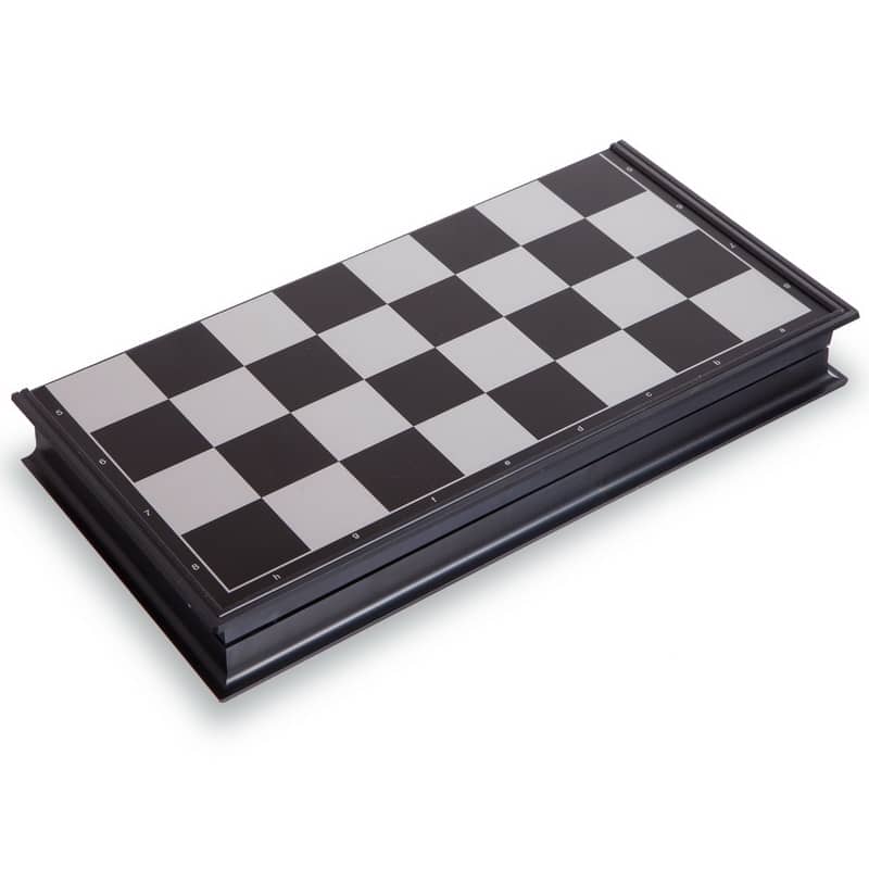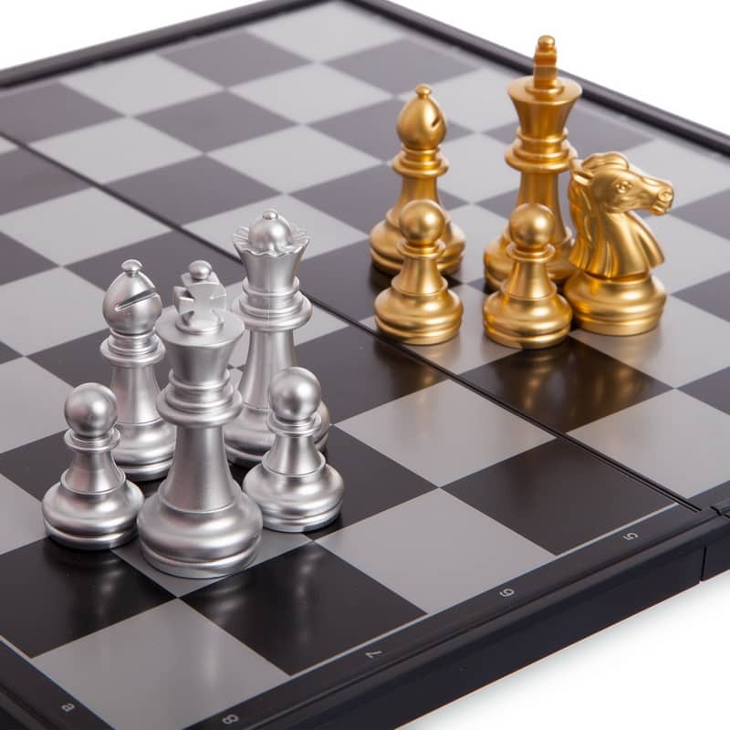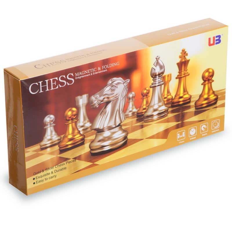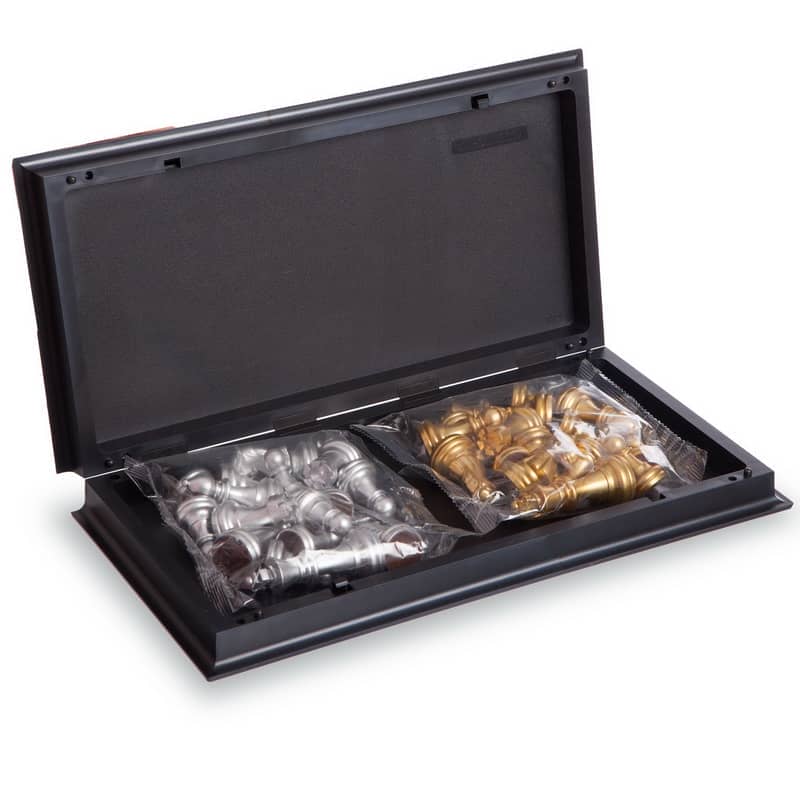 На особливу увагу заслуговує магнітна система: у кожну фігуру вбудований магніт, а саме поле має тонкий металевий шар. Завдяки цьому фігури надійно тримаються на своїх місцях навіть під час трясіння чи нахилу дошки — грати можна не лише вдома, а й у дорозі, не побоюючись випадкового зсуву. Золоті та срібні пластикові фігури виконані у класичному «стаунтонівському» стилі, що надає грі стильного та сучасного вигляду, а також полегшує сприйняття. Розмір дошки у складеному вигляді становить 32 x 16 x 4 см, а в розкладеному – 32 х 32 х 2 см.
