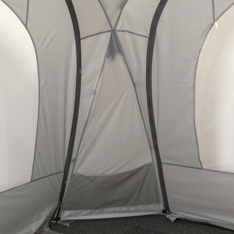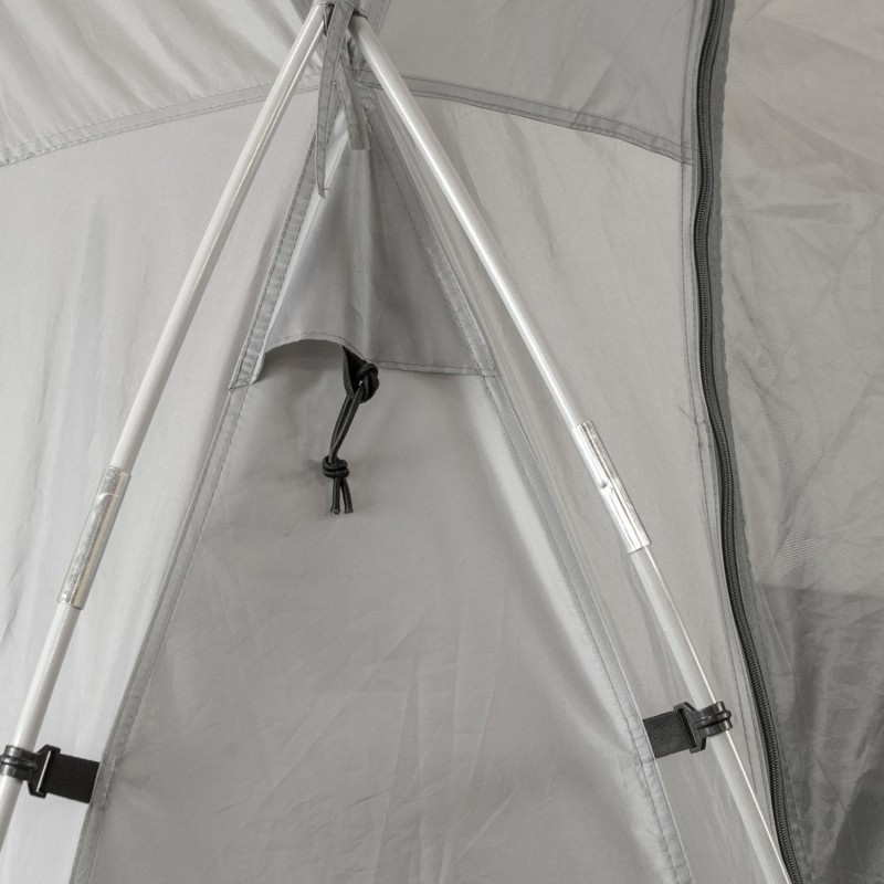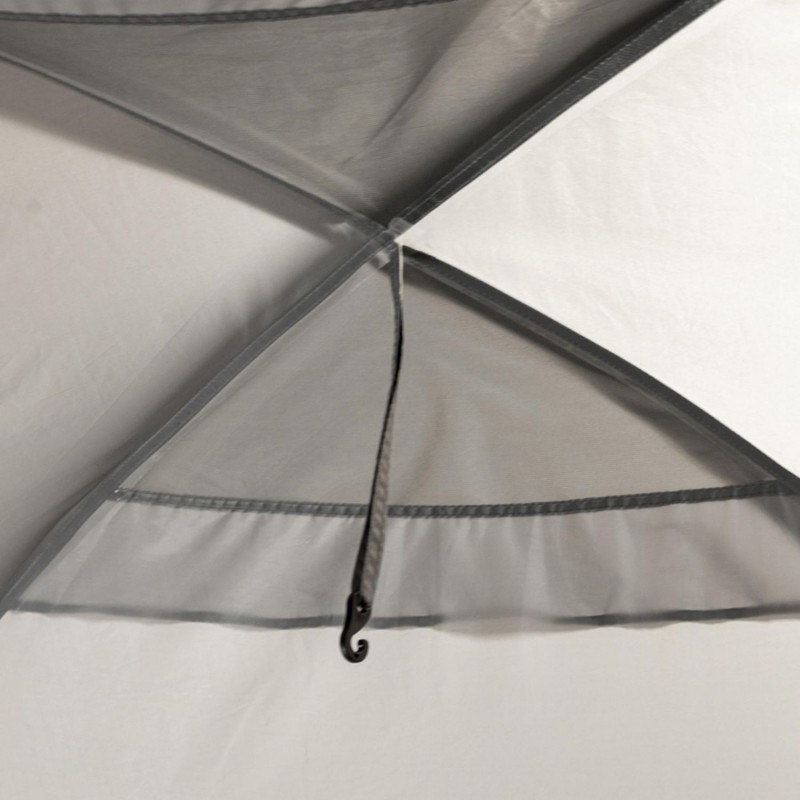 Тент має водозахист на рівні 1200 мм в.ст., що цілком достатньо, аби укритись від короткочасних опадів. Шатро оснащене трьома бічними стінками з вікнами з ПВХ, та однією стінкою з москітною сіткою, які відкриваються і закриваються на блискавках. Вони не знімаються повністю, але можуть зберігатися в спеціальних відділеннях в шатрі, щоб створити більше вільного простору, коли це потрібно. Тож, навіть в дощову погоду, ви можете насолоджуватися свіжим повітрям завдяки тому, що одна з бічних стінок оснащена москітною сіткою, яка дозволяє повітрю вільно циркулювати і захищає від проникнення комах.