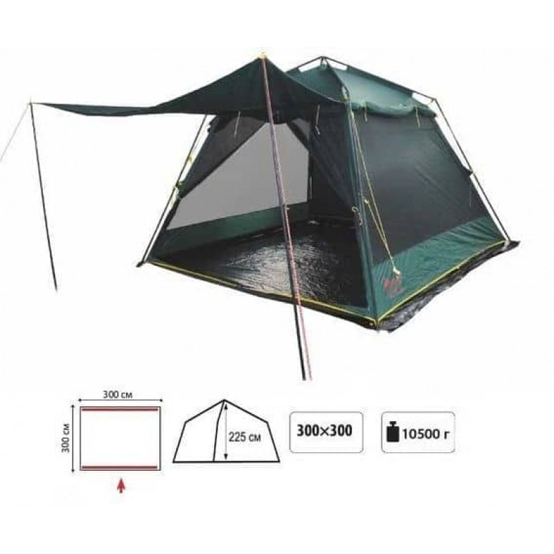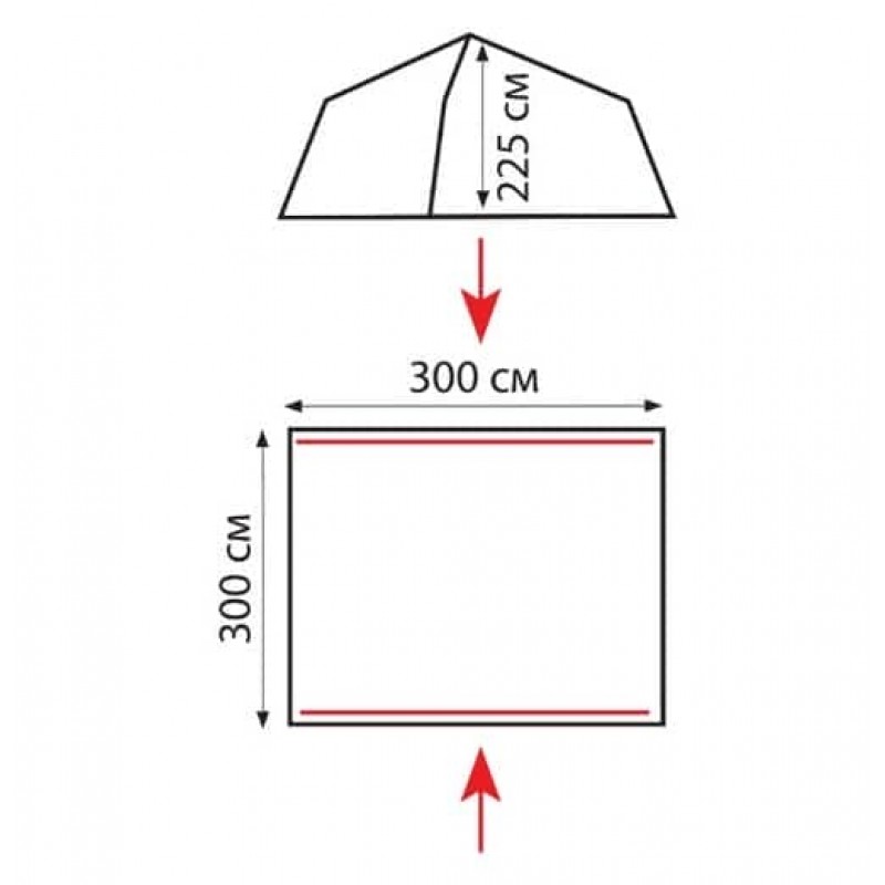 Розмір шатра 3 на 3 метри висота - 2.25 метра, що дозволяє стояти високій дорослій людині в повен зріст не пригинаючись.