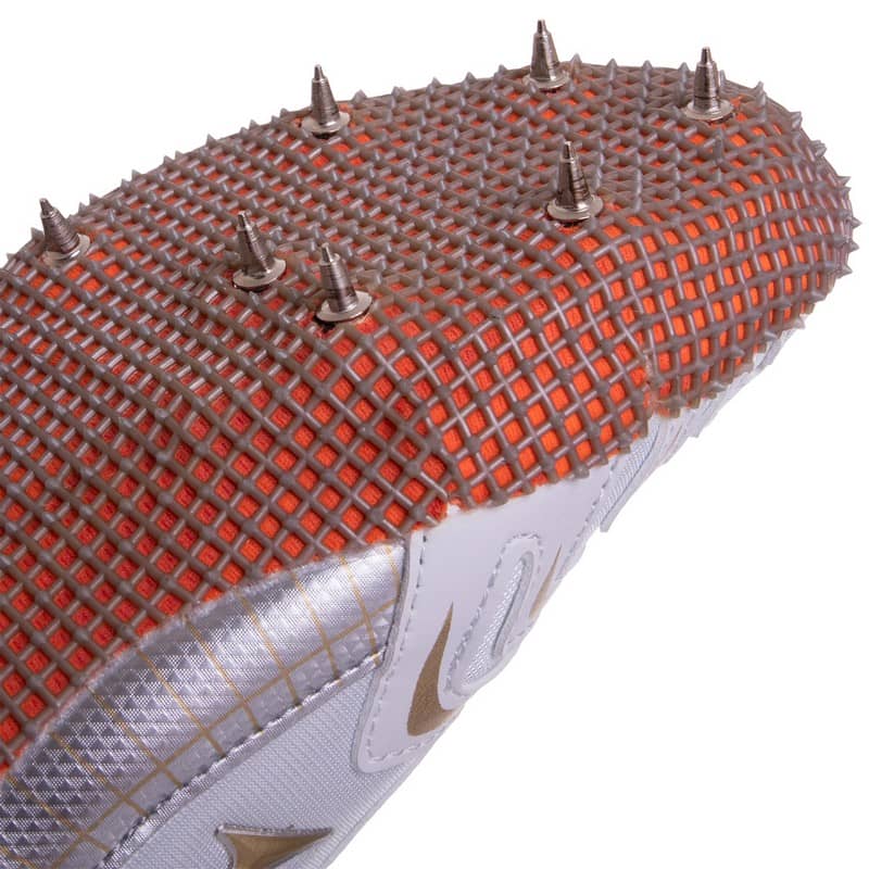 Верх шипування комбінований – для його виготовлення використовуються полівінілхлорид (поліуретан) та поліестер вищої якості. Це дає взуттю пристойний запас міцності та зносостійкості, а також легкість, що важливо для комфортного бігу. Підошва виготовлена з високоякісної гуми (RB), що має пружність, завдяки якій крок атлета стає пружним і легким. У передній частині підошви закріплені металеві шипи, що забезпечують зчеплення з поверхнею, а на ногах фіксуються за допомогою традиційних шнурків.