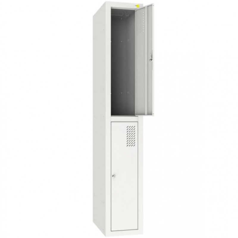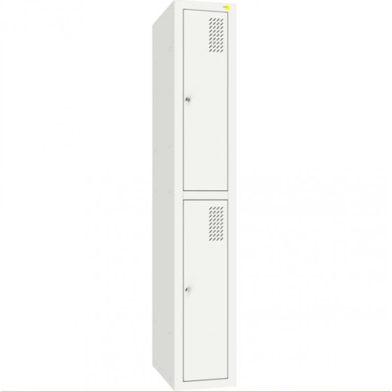 Конструкція: Шафа складається з двох секцій, кожна з яких оснащена окремими дверцятами та індивідуальним замком. Це забезпечує надійне зберігання особистих речей кожного користувача.