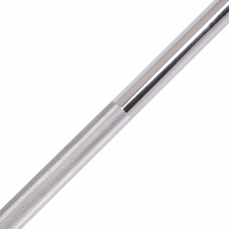 Гриф виготовлений із міцного металу, що забезпечує довговічність та надійність конструкції. У місцях хвата нанесені ромбоподібні насічки, які запобігають ковзанню рук та покращують зчеплення снаряда з долонями навіть під час інтенсивних навантажень. Загальна довжина штанги складає 95 см, що робить її зручною для виконання різних силових вправ без необхідності утримувати рівновагу, як у випадку зі стандартними олімпійськими штангами.