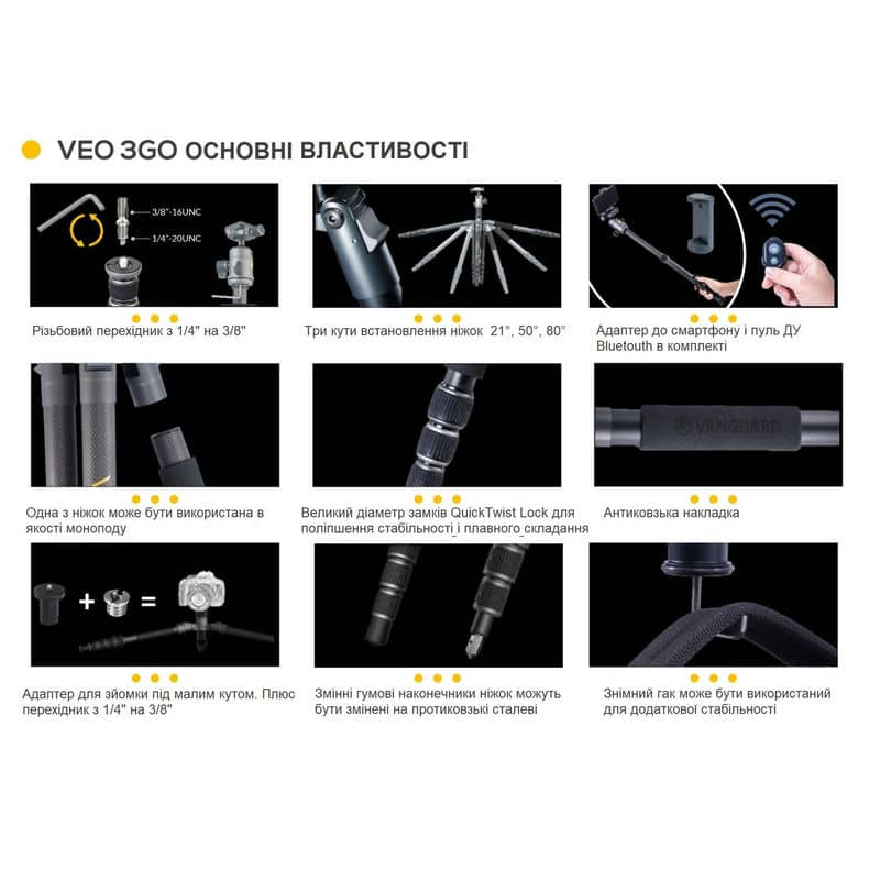 Кращі штативи за версією найбільш авторитетної Міжнародної асоціації видавців фото-, відео- і графічної преси TIPA (Technical Image Press Association) - штативи Vanguard VEO 3GO. Концепція 4 в 1 дозволяє використовувати Vanguard VEO 3GO в якості штативів, моноподів, селфі-палиць, а також використовувати пульт дистанційного керування Bluetouth для стрімів і зйомки відеоблогів.