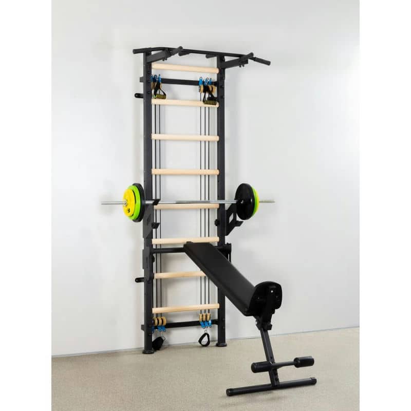Особливість новинки в тому, що металева основа системи еспандерів Крос-тренера закріплюється на дерев'яні поперечини шведської стінки. Всі елементи навісні, спираються на спеціальні металеві пастки, які встановлюються на стійках, що дозволяє зробити заняття на тренажері максимально безпечними і збільшують вагу як самої штанги, так і займається. Шведська стінка дозволяє займатися спортсмену вагою до 130 кг зі штангою, вагою до 200 кг. Підставка під штангу кріпиться на стійку.
