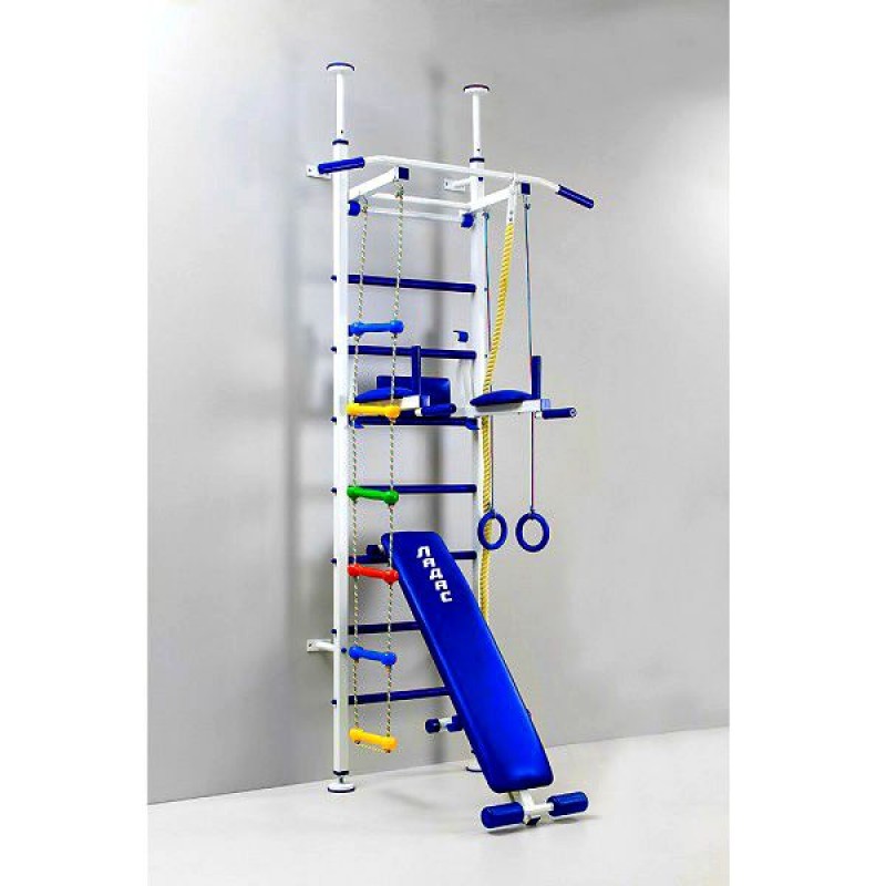 Універсальний домашній тренажер, на якому можна із задоволенням займатися всією сім'єю" це шведська стінка СТ "Одіссей". Дана модель дозволяє дорослим виконувати ефективні вправи для зміцнення свого здоров'я і розвитку тіла, а дітям тренуватися на спеціальному гімнастичному спорядженні, розвиваючи гнучкість і спритність. Регулярні фізичні навантаження покращують загальний стан здоров'я і самопочуття, підвищують імунітет і сприяють емоційної стійкості. Зростаючий дитячий організм потребує регулярних навантаженнях для гармонійного фізичного та інтелектуального розвитку. У комплектацію спорядження входить все, що може знадобитися для повноцінних занять спортом: 1. Гімнастична драбина. Цей снаряд традиційно використовується для підготовки спортсменів, військових,на уроках фізкультури в школі і під час зарядки в дитячому садку. 2. Турнік. Цей елемент переставной, тому його можна розташовувати на зручній для спортсмена висоті. Ручки з ПВХ роблять заняття максимально зручними. 3. Бруси. Сумний снаряд оснащений опорою під поперек і підлокітниками, які дозволяють віджиматися з комфортом. 4. Лава. Валики для ніг дозволяють зафіксувати положення при виконанні вправ. 5. Дитячий навісний комплект. Набір з трьох предметів (каната, кілець і мотузкових сходів) дозволяє дітям висіти, підтягуватися і перекидатися. Завдяки цьому гімнастичному спорядження, заняття малюків будуть не тільки корисними, але й веселими. Будь-який план тренувань можна втілити на функціональному спорткомплексі. Практично всі групи м'язів можна зміцнити, виконуючи різноманітні вправи.Конструкція виконана в привабливих кольорах: білому і синьому. На металеві деталі нанесено полімерне покриття, створене методом порошкового фарбування. Ручки, підлокітники, м'яка частина лавки, опора під спину виготовлені з синього ПВХ і шкірозамінника. Виробник надає сертифікат якості на свою продукцію ТУУ 36.1-21940919-2014 з ізм. №1 і санітарно-гігієнічний висновок №05.03.02-04 / 38877 від 13.06.2014 р Ці документи підтверджують безпеку і високу якість інвентарю.